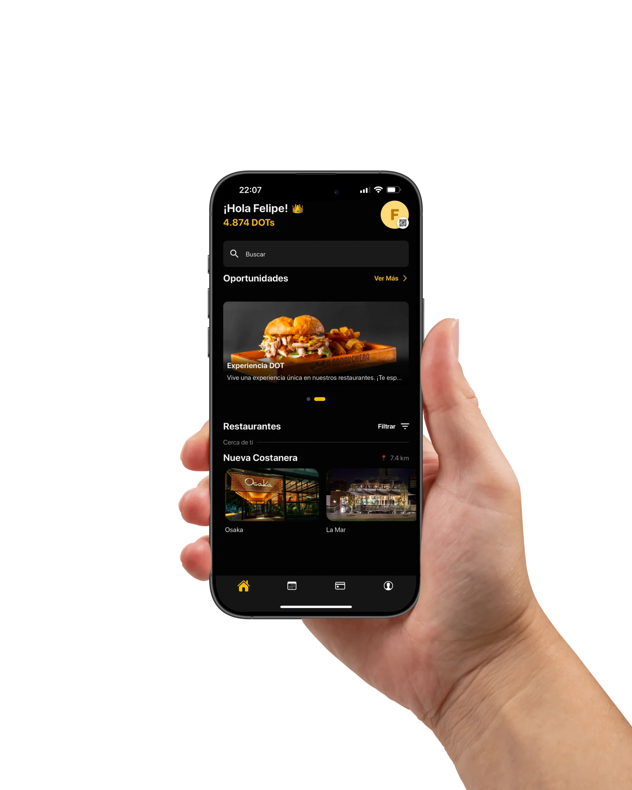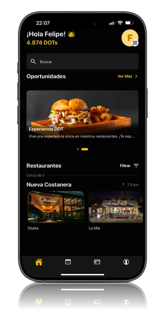 DOT es una aplicación de fidelización que no solo te permite acumular puntos de cashback cada vez que disfrutas de una comida en los restaurantes asociados, sino que también es un lugar para descubrir nuevos restaurantes y explorar una amplia cartelera de eventos exclusivos. Es la herramienta perfecta para maximizar tus experiencias gastronómicas y de entretenimiento.